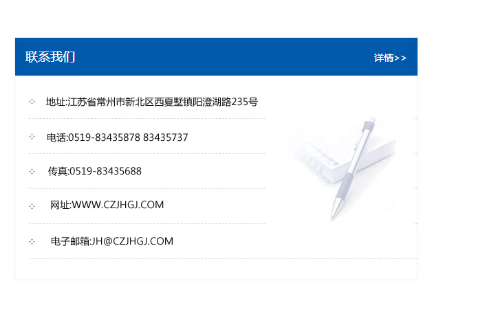 地址:常州市新北區友邦商務大廈1幢16、17層  電話:0519-85101652  傳真:0519-85112595  郵編:213022  網址:www.cz-jiayue_cn.ziranhuxi.com  郵箱:xiajifengaa@163.com